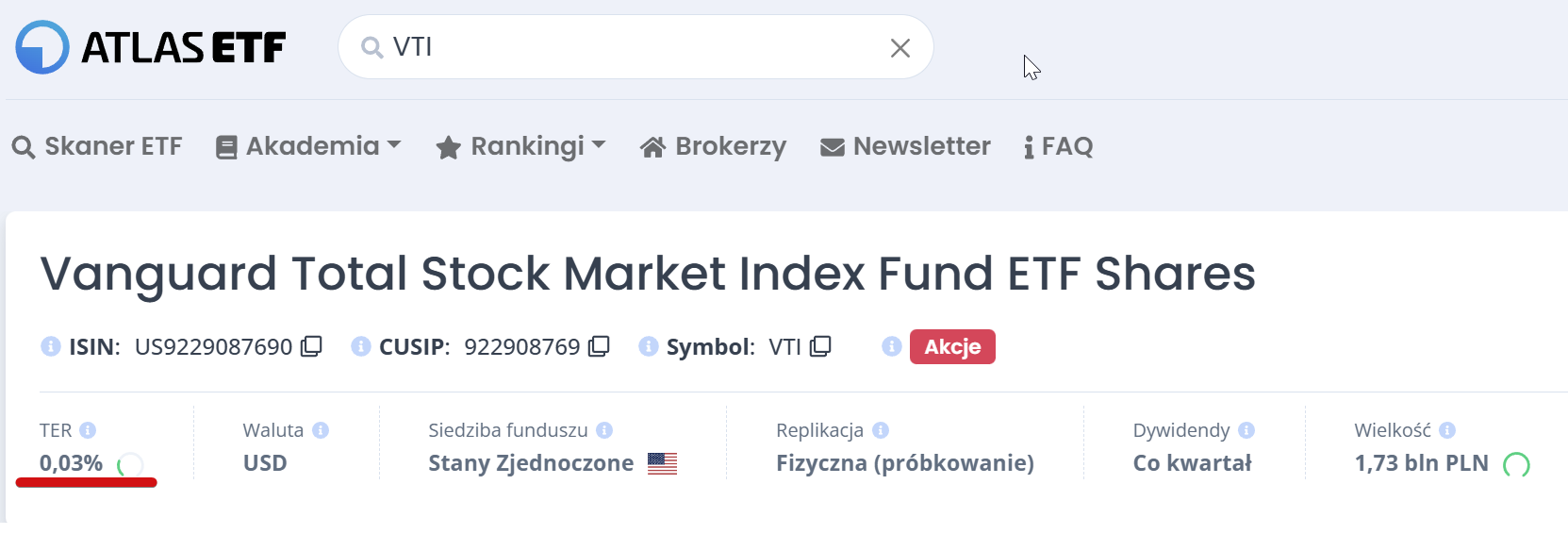 Brak informacji o polityce dywidendowej, walucie czy UCITS podpowiada nam, że najprawdopodobniej jest to ETF amerykański.