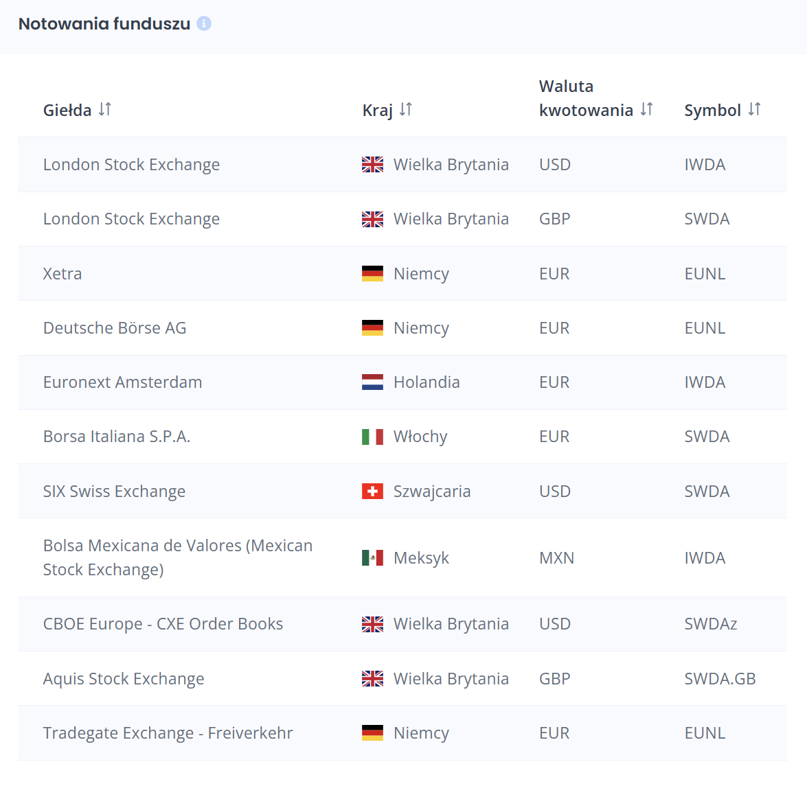 - Euronext Amsterdam (Holandia, EUR): IWDA
