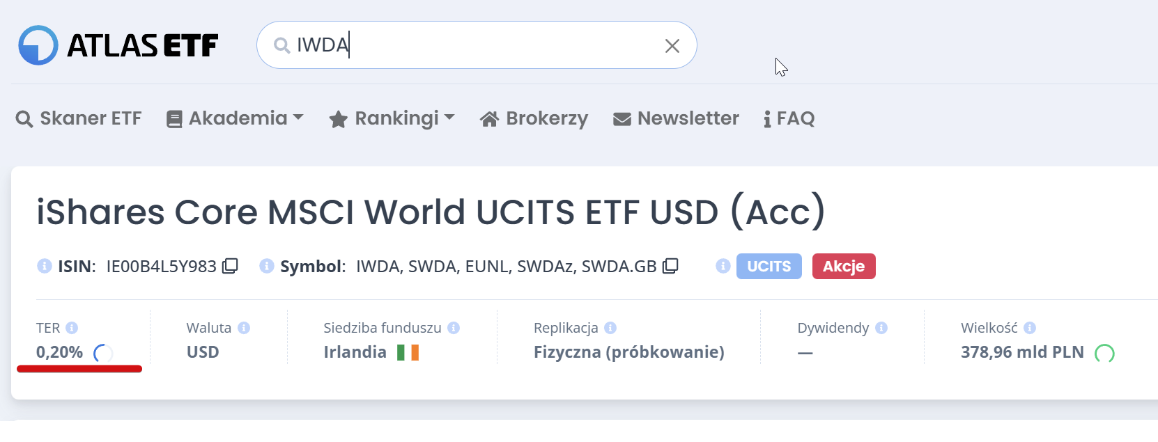 Przykładowo, popularny ETF iShares Core MSCI World UCITS ETF (IWDA) ma TER na poziomie 0,20%, a Vanguard FTSE All-World UCITS ETF (VWCE) – 0,22%. Wskaźnik TER można oczywiście sprawdzić na naszej stronie.