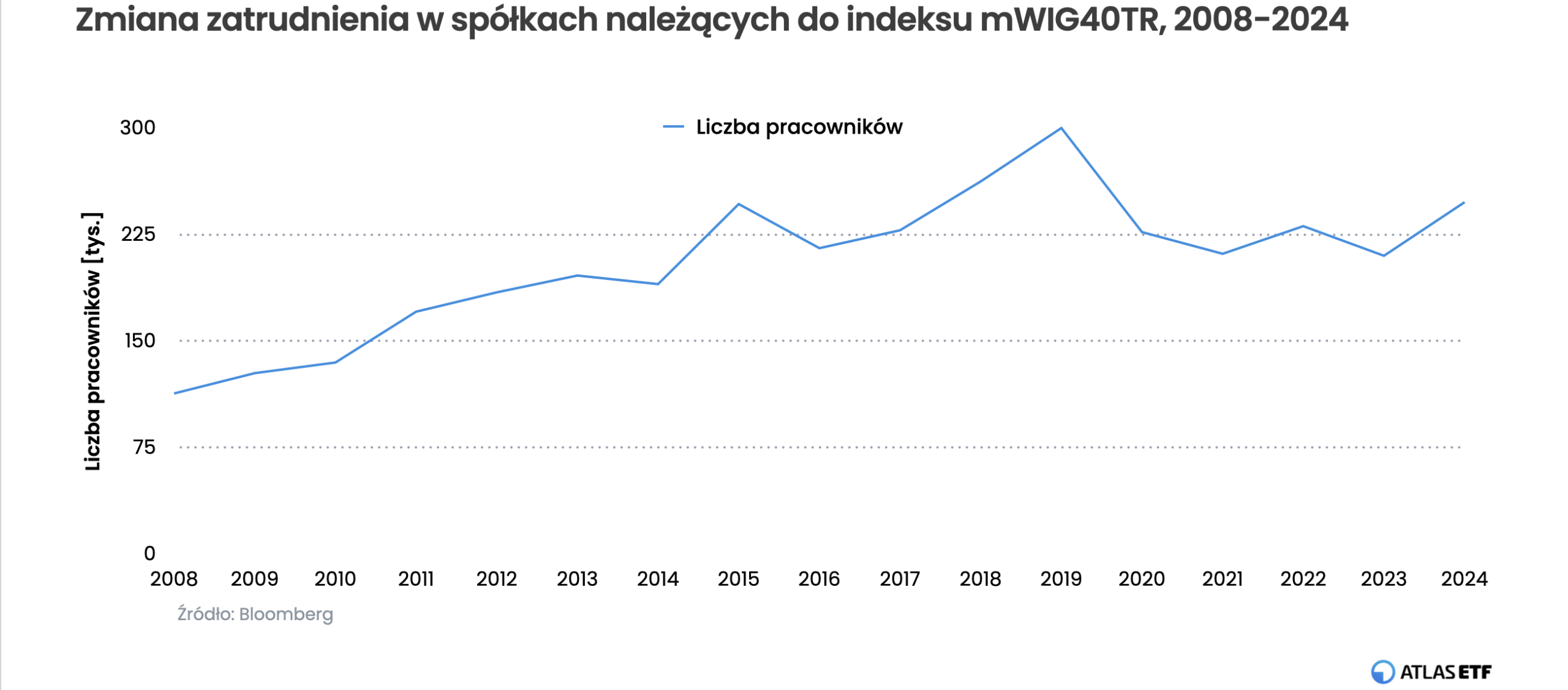 Akcje wchodzące w skład indeksu mWIG40TR to nie są tylko liczby na wykresach. Każda z tych spółek to realna firma, która prowadzi działalność, generuje przychody i wypracowuje zyski. Te przedsiębiorstwa zatrudniają tysiące pracowników i mają wpływ na rozwój polskiej gospodarki. Inwestując w ETF na mWIG40TR, stajemy się pośrednio współwłaścicielami części tych firm. To właśnie ich codzienna praca, innowacje i dążenie do zwiększania zysków budują wartość indeksu. Poniżej znajdziesz wykres pokazujący historyczną zmianę zatrudnienia w spółkach wchodzących w skład indeksu. Długoterminowy trend zatrudnienia jest wzrostowy, co wskazuje na systematyczny rozwój tych przedsiębiorstw.