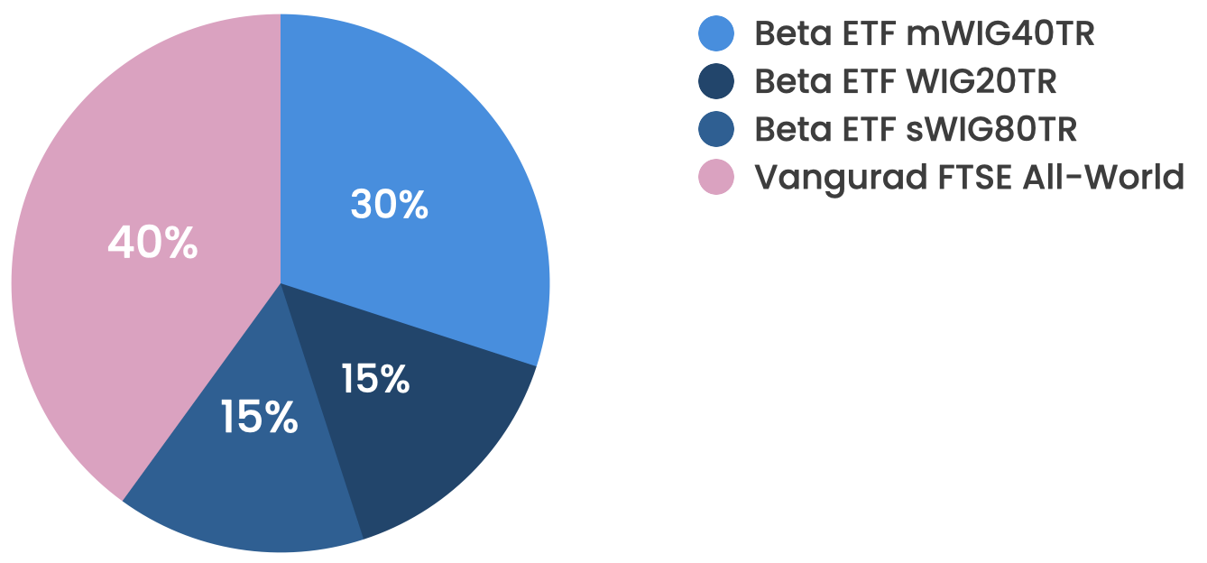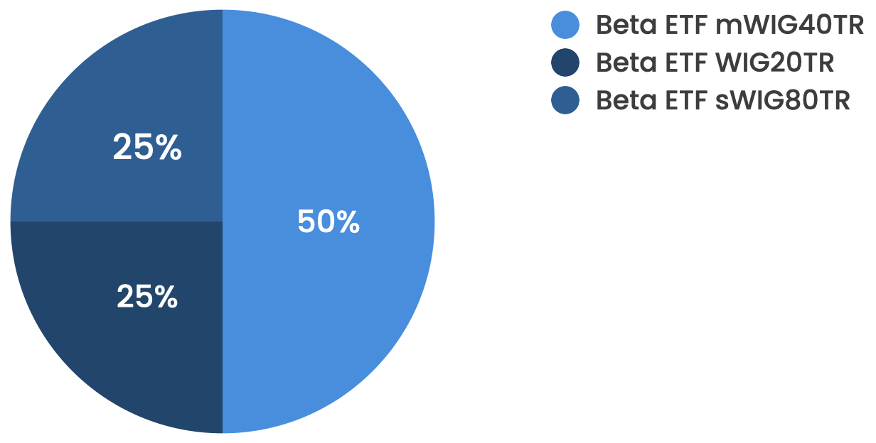 W tej konstrukcji Beta ETF mWIG40TR odpowiada za 30% portfela, zapewniając ekspozycję na segment spółek o średniej kapitalizacji, które historycznie dawały wyższe stopy zwrotu niż największe firmy z WIG20. Taki portfel jest odpowiedni dla osób o umiarkowanej tolerancji na ryzyko, które chcą łączyć długoterminowy wzrost kapitału z ochroną jego części przed stratą.