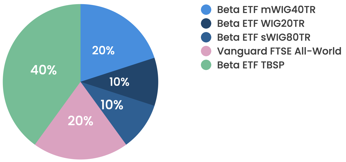 To bardzo zdywersyfikowany portfel, który łączy ekspozycję na polskie akcje, globalne rynki oraz polskie obligacje skarbowe. Zamiast obligacji detalicznych EDO, kluczową rolę stabilizującą pełni tutaj Beta ETF TBSP – pierwszy w Polsce fundusz ETF odwzorowujący indeks TBSP, czyli oficjalny indeks polskich obligacji skarbowych. Beta ETF TBSP inwestuje w szeroki portfel stałokuponowych i zerokuponowych obligacji skarbowych denominowanych w złotych, zapewniając inwestorom niską zmienność, brak ryzyka walutowego oraz możliwość uzyskiwania stabilnych dochodów odsetkowych.