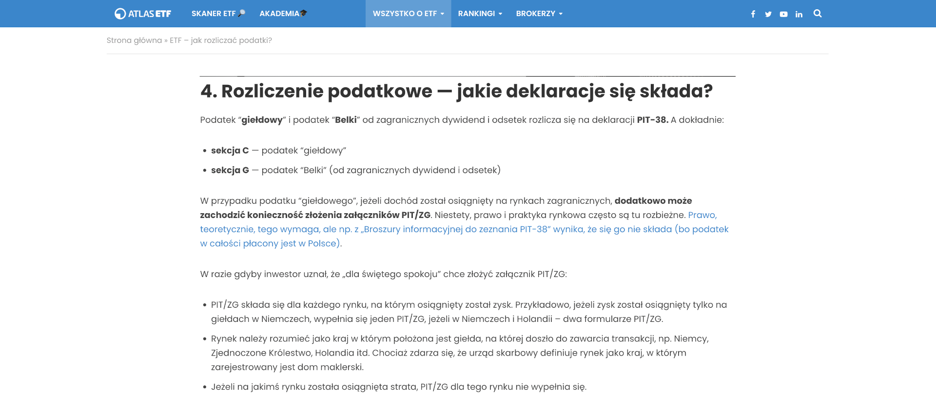 Zgodnie z artykułem ETF – jak rozliczać podatki w każdym roku, w którym dokonujemy sprzedaży, musimy złożyć deklarację PIT-38. Inwestując na rynkach zagranicznych w pewnych może się pojawić potrzeba złożenia dodatkowo załączników PIT/ZG. To załączniki, w których wykazuje się jaka część zysku została osiągnięta na poszczególnych rynkach oraz jaka część podatku została poniesiona na rynkach zagranicznych a jaka część została do dopłaty w Polsce. Składa się je dla każdego rynku osobno, a rynek najczęściej definiuje się jako kraj, w którym położona jest giełda, na której zawarliśmy transakcję (chociaż niektóre urzędy skarbowe stosują interpretację, że rynek to kraj rejestracji brokera).
