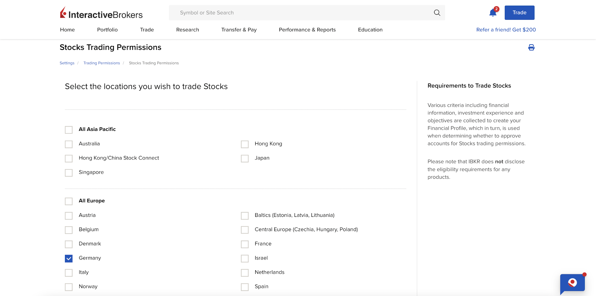 Gdyby ktoś chciał ograniczyć liczbę rynków, na których realizowane są transakcje do jednego, np. Niemcy, można to zrobić w ustawieniach Trading Permissions. Aby je otworzyć należy kliknąć prawym górnym w swoje Imię –> Ustawienia (Settings) –> Trading Permissions –> Stocks (Add/Edit).