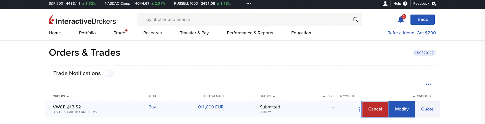 Wyświetlają się dwie opcje: Cancel i Modify. Aby anulować zlecenie można wybrać “Cancel”, ale my tego nie chcemy. Chcemy je zmodyfikować (a konkretnie limit ceny) – klikamy Modify.
