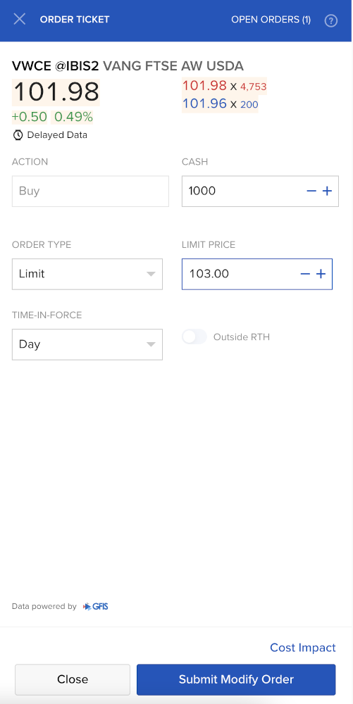 Wyświetli się formularz zlecenia. Wcześniej podaliśmy limit 102 i okazało się, że to za mało. Tym razem wpisujemy 103. Potwierdzamy przyciskiem “Submit Buy Order“.
