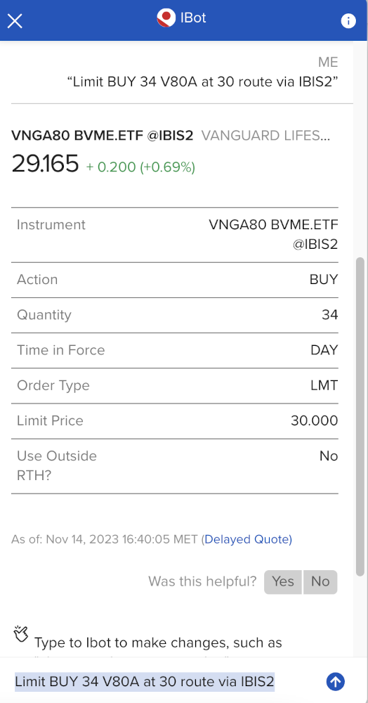 Utworzy się zlecenie kupna z limitem ceny na Vanguard LifeStrategy 80/20, które będzie gotowe do wysłania bezpośrednio na rynek IBIS2, czyli Xetra. Pomimo, że wpisaliśmy ticker V80A, wyświetla się VNGA80 (ticker z Borsa Italiana). Nie przejmujcie się tym. Poniżej jest potwierdzenie, że zlecenie zostanie wysłane na IBIS2 (Xetra). Ważność zlecenia to jeden dzień.