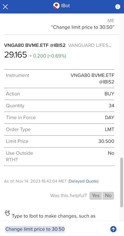 Gdyby się okazało, że jednak chcemy coś zmienić, możemy zmodyfikować utworzone zlecenie, wpisując odpowiednią komendę. Przykładowo, jeżeli chcielibyśmy zmienić limit ceny na 30,5, możemy wpisać “Change limit price to 30.50“.