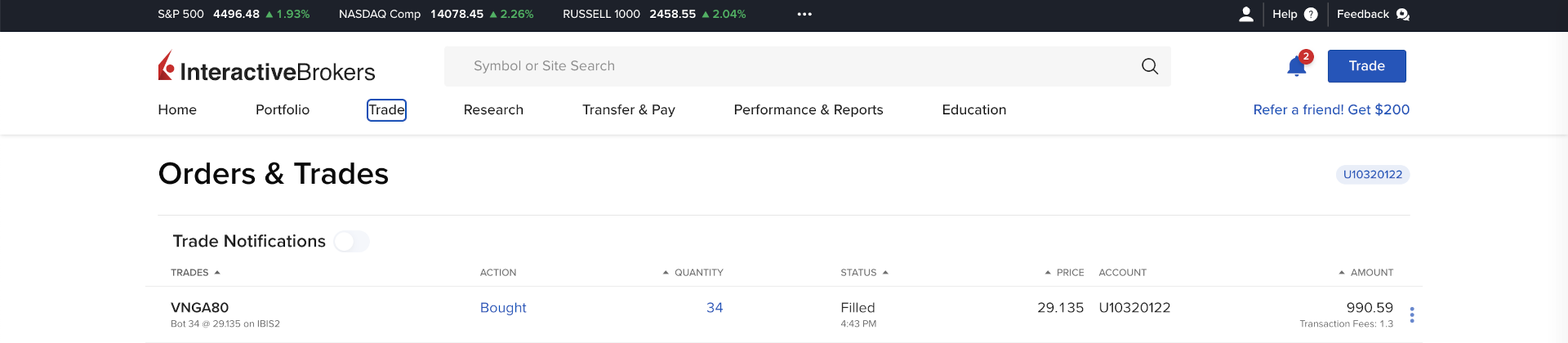 Widzimy, że zlecenie się zrealizowało po 29,123 na IBIS2, czyli Xetra. Pobrana została prowizja 1,3 EUR.
