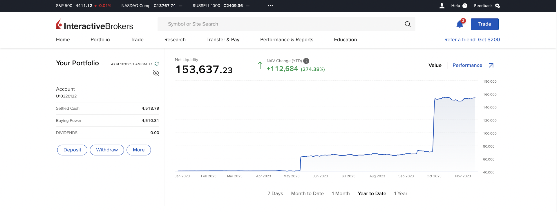 Zalogowaliśmy się na portal klienta. Przed nami widok główny. Na samej górze jest pole tekstowe “Symbol or Site Search“, w którym można wyszukiwać instrumenty finansowe lub różne opcje platformy IBKR. Z lewej strony jest saldo konta, a po prawej, w części głównej, historia zmian wartości rachunku wyrażona w walucie bazowej (klient określa ją podczas rejestracji rachunku, ale można ją w każdej chwili zmienić w ustawieniach).