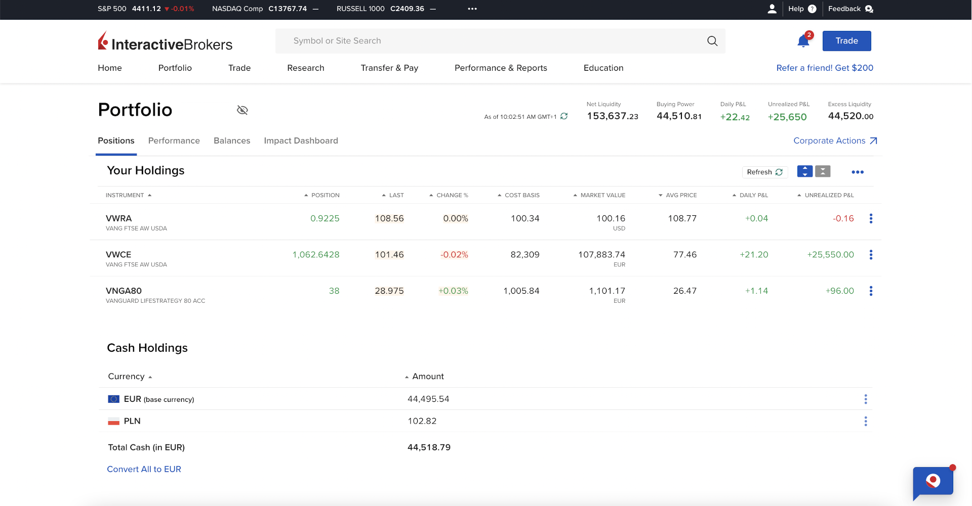 Na swój rachunek w Interactive Brokers można wpłacać wszystkie obsługiwane waluty, jeśli posiadamy je na rachunku w swoim banku. Można też wygodnie wpłacać PLN przelewem krajowym. Chcąc inwestować w ETF-y w walutach obcych polskie złote trzeba zamienić na docelową walutę. Wymiana waluty w IBKR kosztuje 2 USD.