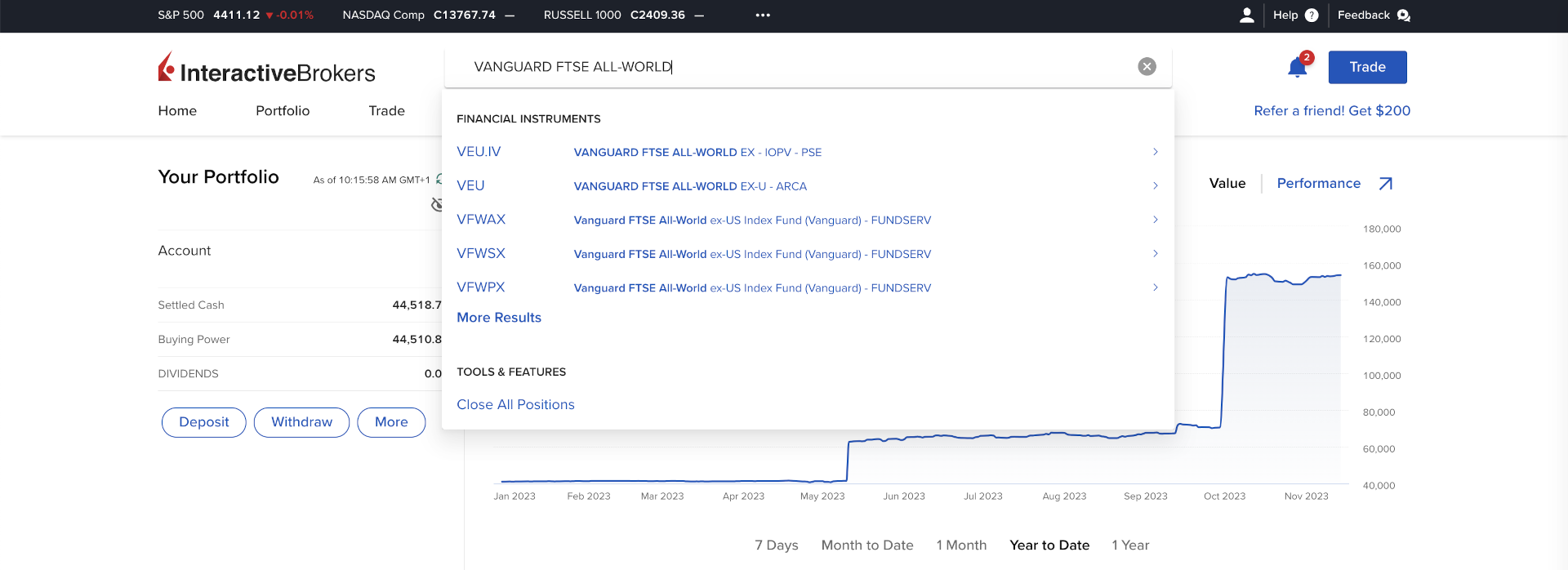 Można też najpierw wyszukać dany instrument w polu wyszukiwania. Załóżmy, że chcemy wyszukać Vanguard FTSE All-World UCITS Acc. Po wprowadzeniu w polu wyszukiwania, system go nie znajduje. Niestety, w IBKR czasem tak to wygląda. Rozwiązaniem powinno być wyszukanie nie po nazwie, lecz po tickerze. Można go sprawdzić np. na stronie atlasETF.pl.