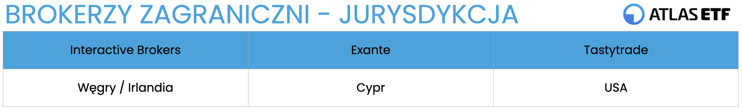 Brokerzy oferujący ETF-y amerykańskie bywają zarejestrowani w różnych krajach. Jako najbardziej bezpieczne najczęściej postrzegane są firmy z Europy Zachodniej i USA. Z tego punktu widzenia korzystnie wypadają Interactive Brokers (możliwość otwarcia konta w Irlandii) oraz Tastytrade (USA).
