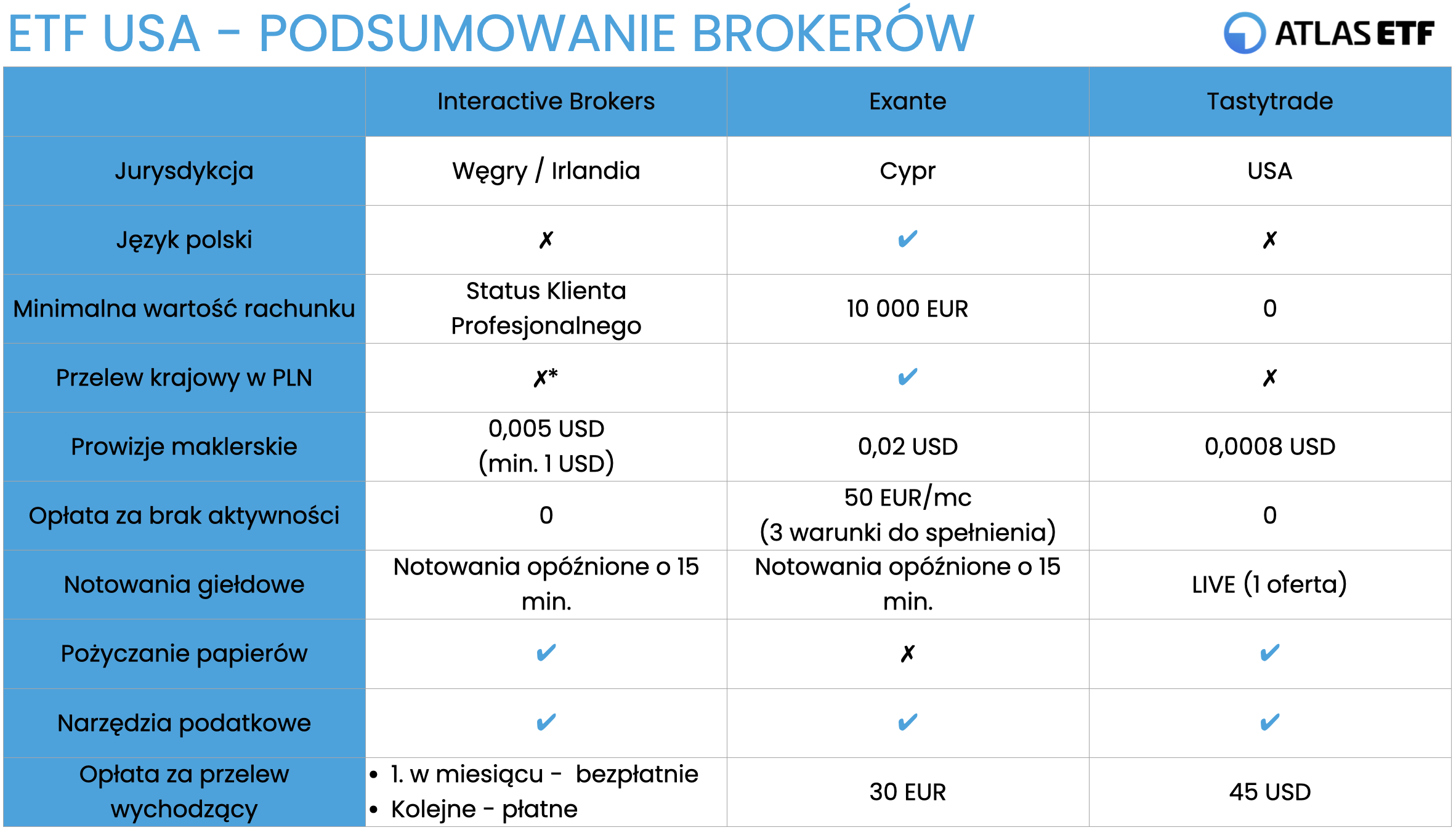 Pierwsze miejsce zajmuje Tastyworks. Do brokera zachęcać mogą jurysdykcja amerykańska, niskie prowizje, bezpłatne notowania giełdowe LIVE, możliwość zarabiania na pożyczaniu papierów i niski próg wejścia oraz możliwość uzyskania raportu podatkowego z pomocą narzędzi podatkowych. Zniechęcać mogą potencjalnie wysokie koszty przelewów USD na rachunek (SWIFT) oraz przelewów wychodzących (45 USD). Z tego powodu Tastyworks to w praktyce również rozwiązanie dla osób z większym kapitałem, pomimo że sam broker nie wymaga wpłaty określonej wysokości środków. Dla osób z mniej zasobnym portfelem lepszym pomysłem mogą się okazać ETF-y europejskie.
