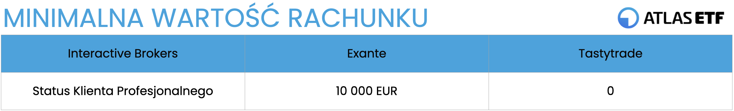 Wielkość kapitału to prawdopodobnie największa bolączka osób zainteresowanych inwestowaniem w ETF-y amerykańskie. Chcąc inwestować przez Interactive Brokers trzeba posiadać status klienta profesjonalnego. Aby go uzyskać trzeba spełnić dość restrykcyjne warunki. W największym skrócie trzeba posiadać spory kapitał, sięgający nawet 500 000 EUR.
