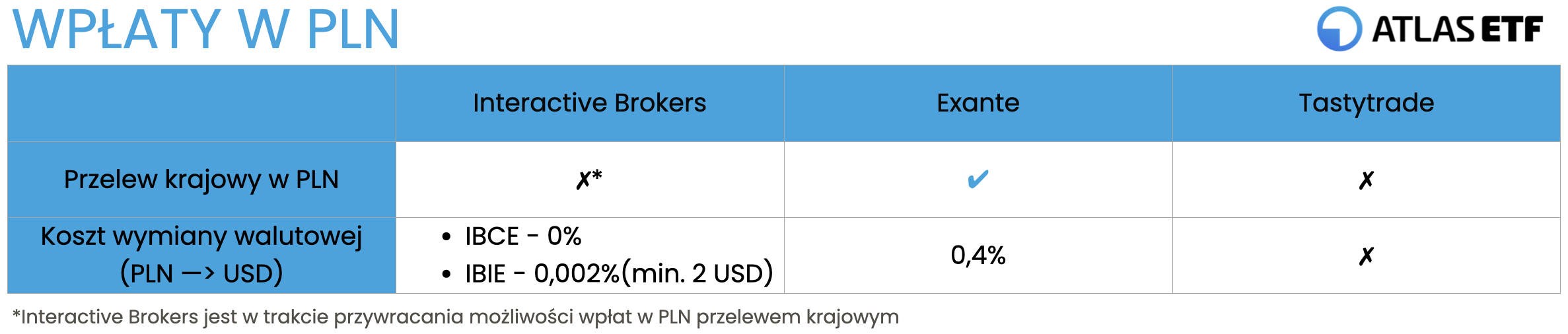 IBKR pracuje nad wprowadzeniem (a w zasadzie przywróceniem) możliwości wpłat w PLN przelewem krajowym. Spora część klientów może już cieszyć się taką funkcjonalnością. Pozostałym klientom jest to systematycznie udostępniane. Ci, którzy jeszcze czekają, chcąc obniżyć koszt przelewu, mogą wymienić PLN na EUR w innym miejscu i wykonać przelew EUR do IBKR bezpłatnym przelewem SEPA. Można też skorzystać z banków, które oferują bezpłatne przelewy walutowe.
