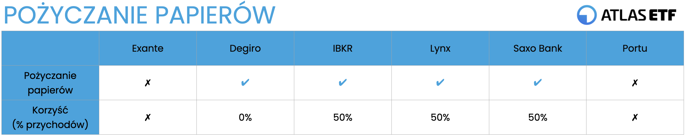 Inwestor może otrzymywać pieniądze od brokera nie tylko z tytułu oprocentowania gotówki na rachunku. Istnieje też możliwość zarabiania na pożyczaniu papierów wartościowych. Takie pożyczki są zabezpieczone. W Polsce to nadal nowość, ale na zachodzie są dość powszechne. Skorzystanie z takiej usługi umożliwiają IBKR, Lynx i Saxo Bank. Wynagrodzenie klienta to w uproszczeniu 50% przychodów brokera.