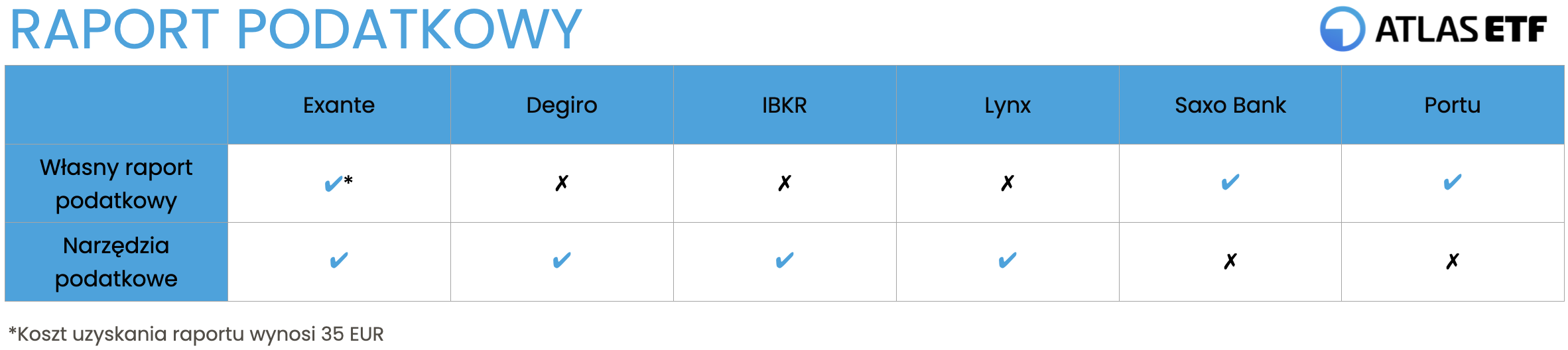 Exante też oferuje raport, ale od niedawna jest on płatny (35 EUR). W pozostałych przypadkach można skorzystać z narzędzi podatkowych (w tym bezpłatnych), dzięki którym można uzyskać analogiczny raport podatkowy. Jak działają takie narzędzia można przeczytać w artykule Narzędzia podatkowe – jak rozliczać brokerów zagranicznych.