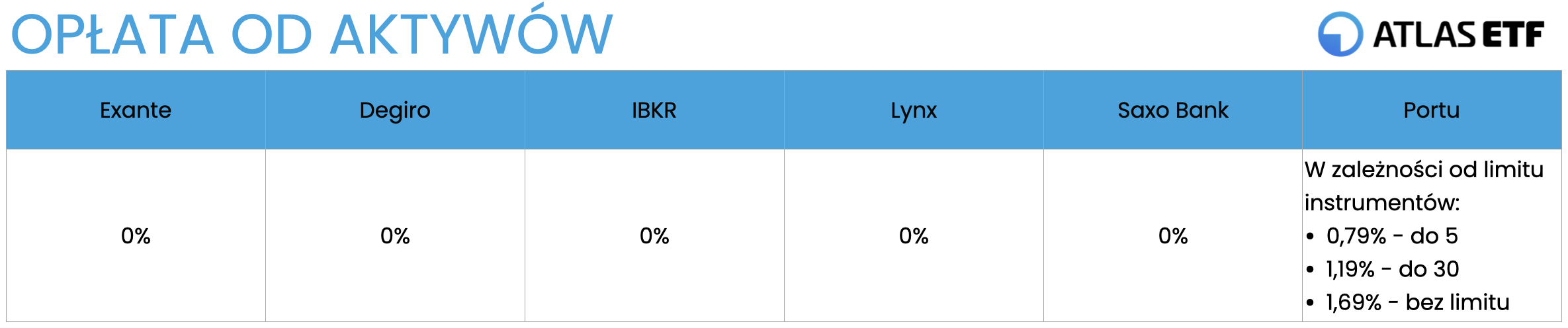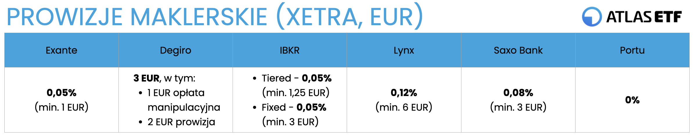 Wysokość prowizji pobieranych przez brokerów jest zróżnicowana. Portu nie pobiera żadnych prowizji, co nie oznacza, że jest bezpłatny (pobierana jest opłata od aktywów). Tanio jest w Exante (0,05%) oraz IBKR (przy mniejszych kwotach korzystna jest zwłaszcza taryfa Tiered) i Saxo Bank. W