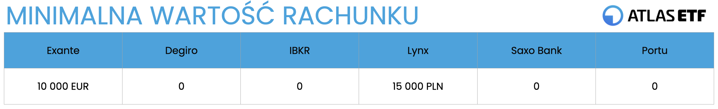 Brokerzy coraz częściej odchodzą od wymogów co do minimalnej wartości rachunku, dzięki czemu mogą z nich korzystać również osoby z mniejszym kapitałem. W niektórych przypadkach jednak jeszcze funkcjonują. Minimalna wartość rachunku w Exante to 10 000 EUR, w Lynx 15 000 PLN.
