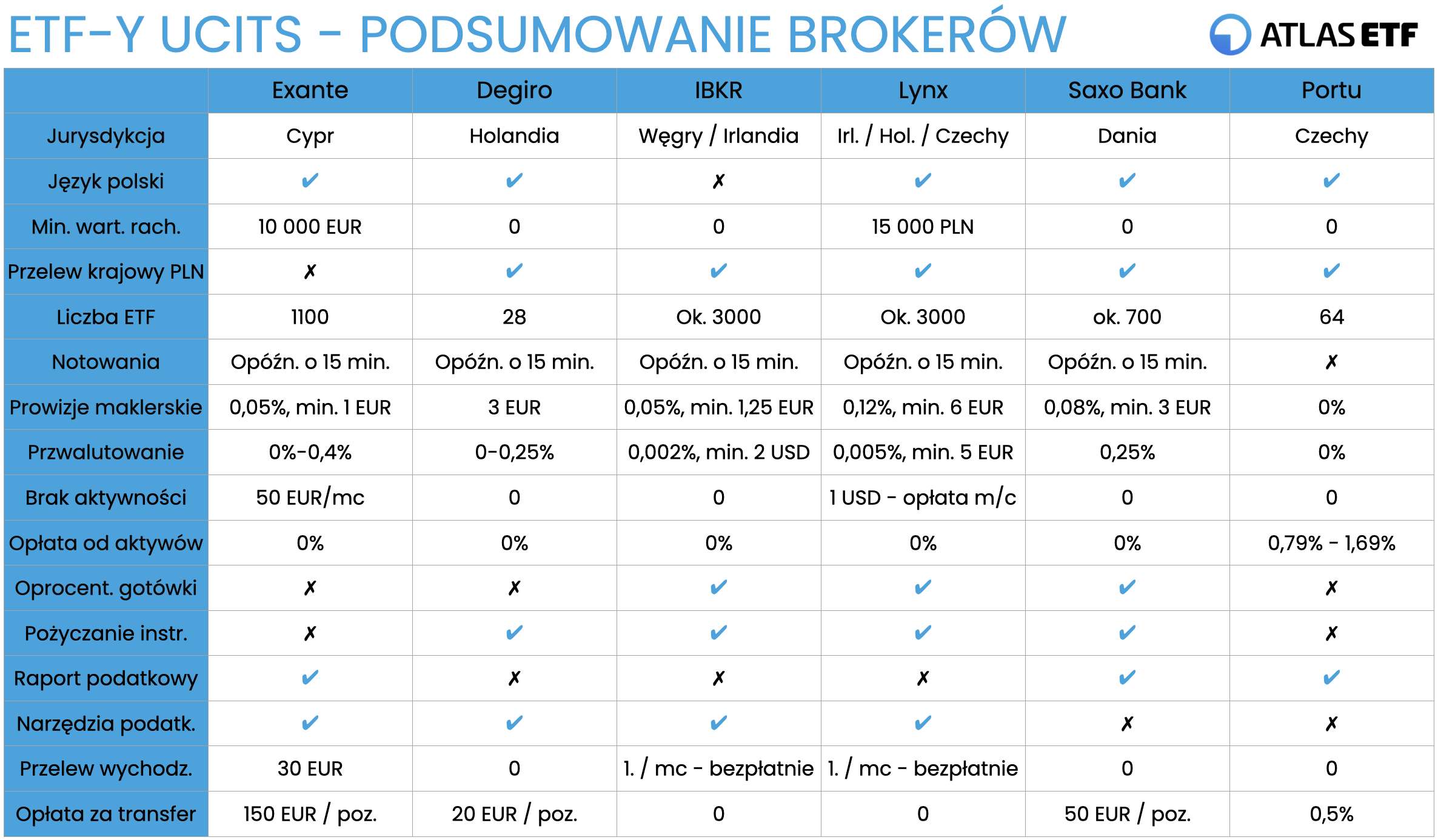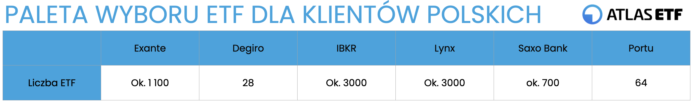 Największy wybór jest w Interactive Brokers i Lynx – około 3000 instrumentów. Spora paleta jest w Exante (około 1 100) oraz w Saxo Bank (ok. 700). Najmniej jest w Portu (64) i w Degiro (28). W Degiro lista ETF wcześniej była dużo dłuższa, lecz została skrócona w związku ze sposobem interpretacji regulacji prawnych.