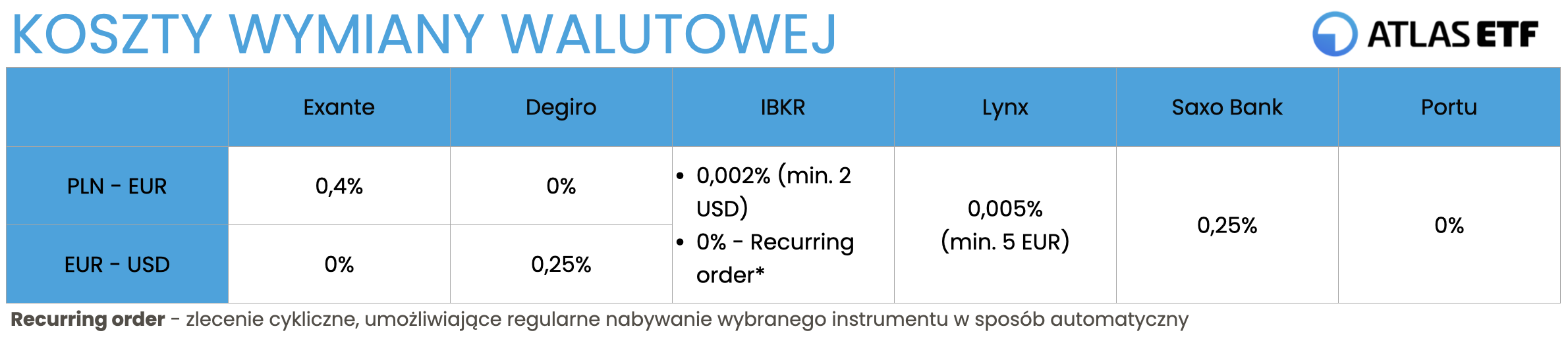 W Portu wymiana walutowa jest bezpłatna (ale, dla przypomnienia, występuje tam opłata od aktywów). Niedrogo jest Interactive Brokers (0,002%), jednak minimalna wartość prowizji wynosi 2 USD, więc bardzo małych kwotach może być ona “odczuwalna” (przy czym zlecenia cykliczne są zwolnione z opłaty). W Lynx opłata nominalnie też jest niewysoka (0,005%), ale minimalna wartość prowizji jest wyższa (5 EUR).