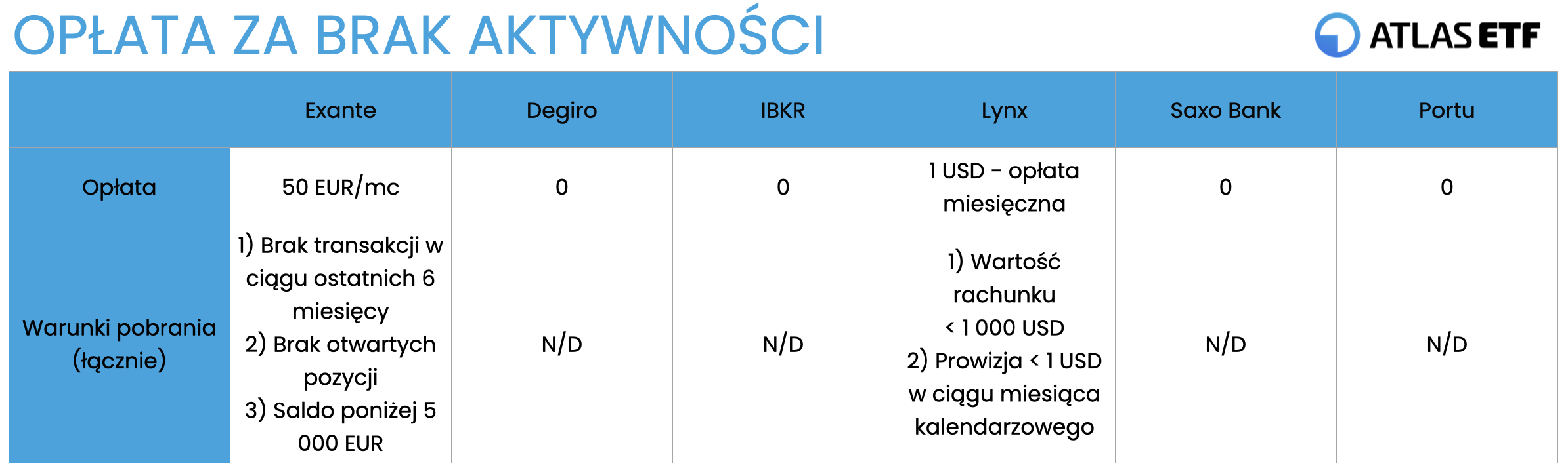 Taka opłata może się pojawić w Exante i Lynx, chociaż aby została pobrana, trzeba się bardzo “postarać”. Szczegóły w tabeli poniżej.