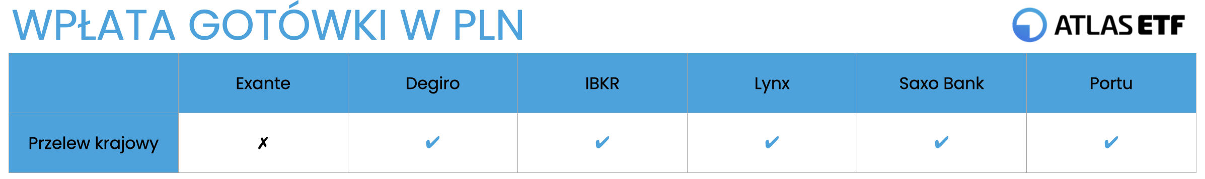 Do brokerów zagranicznych coraz częściej można wpłacać PLN przelewem krajowym (który najczęściej jest bezpłatny). Tak można wpłacić środki do Degiro, Saxo Bank, Interactive Brokers, Lynx czy Portu. Do Exante też można wpłacać PLN, jednak nie przelewem krajowym, lecz przelewem zagranicznym SWIFT, który często bywają kosztowne (np. 0,25% kwoty przelewu).