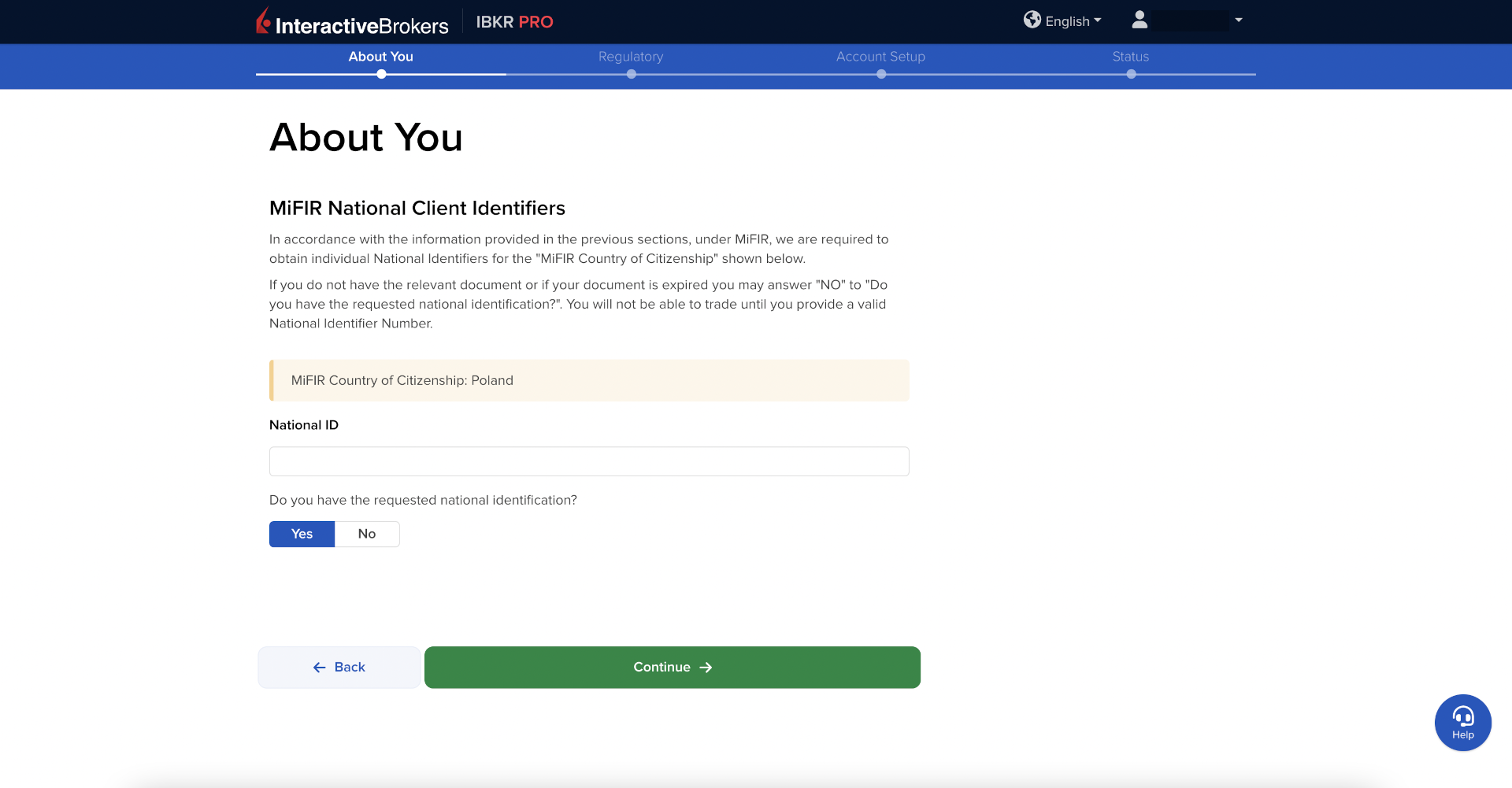 W drugiej części sekcji About you, wypełniając wymogi dyrektywy MIFIR, należy podać numer PESEL. Potwierdzamy klikając Continue.
