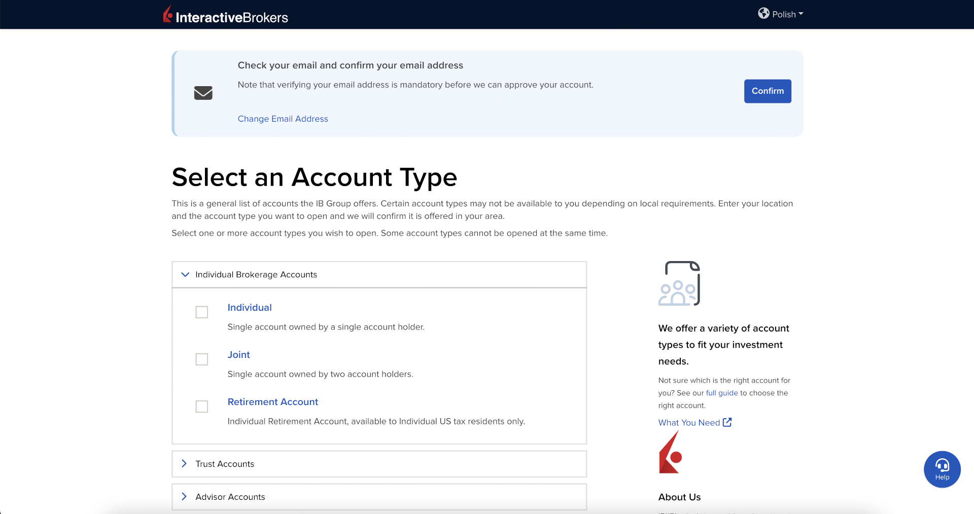 Select an Account type – określamy typ konta, które zamierzamy otworzyć. Dla klientów indywidualnych do wyboru są konto indywidualne (Individual), wspólne (Joint) lub emerytalne (Retirement Account). Konta emerytalne to nie IKE i IKZE (mogą być prowadzone tylko przez polskie instytucje), lecz specjalne rachunki emerytalne dostępne dla obywateli USA.