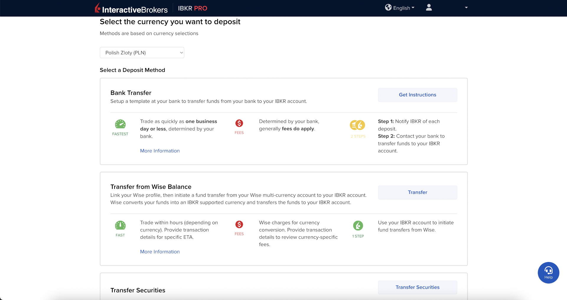 W 2023 Interactive Brokers wyszedł na przeciw polskim klientom i umożliwił wpłacanie złotych z polskich banków przelewem krajowym, który przez Internet co do zasady jest bezpłatny. Wysyłając pieniądze rano standardowym przelewem “Elixir” środki prawdopodobnie dotrą jeszcze tego samego dnia, a wybierając przelew ekspresowy pieniądze na naszym koncie w IBKR mogą być nawet w ciągu kilkunastu/kilkudziesięciu minut.